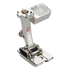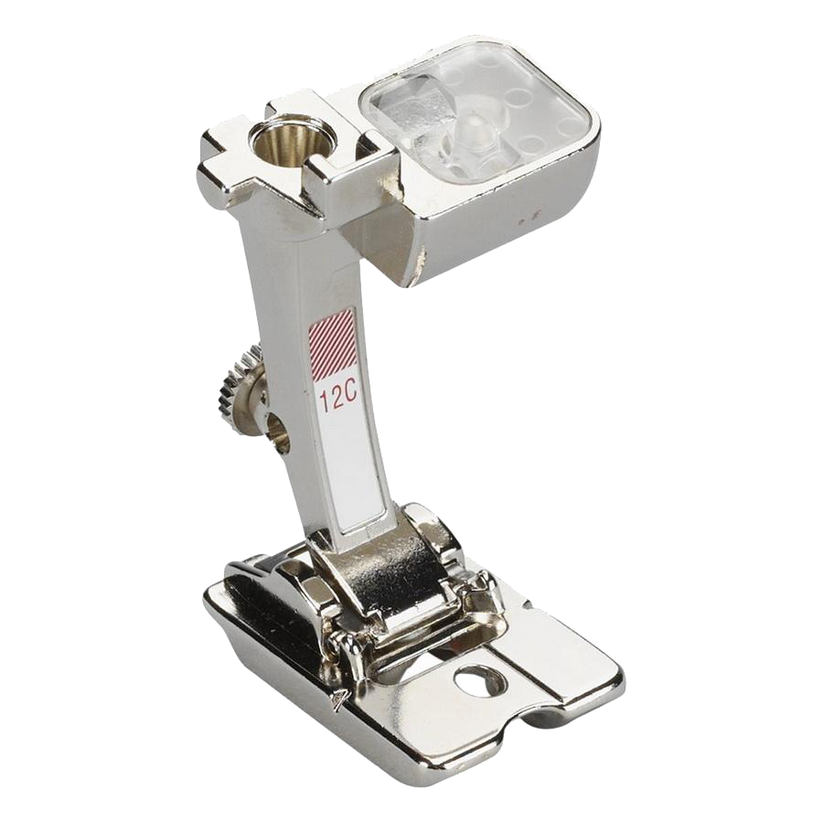 The BERNINA Bulky Overlock Foot #12C has a wide groove in the sole, making it ideal for sewing bulky knitted fabrics or for attaching leather strips. One side of the sole is longer than the other, allowing even thick and uneven fabrics to travel under it smoothly. The presser foot also has a guide hole for sewing over piping cord. Furthermore, the Bulky Overlock Foot #12C is also a popular presser foot for attaching thick cords and sequins, enabling you to create stylish embellishments on garments, needlework and home furnishings.