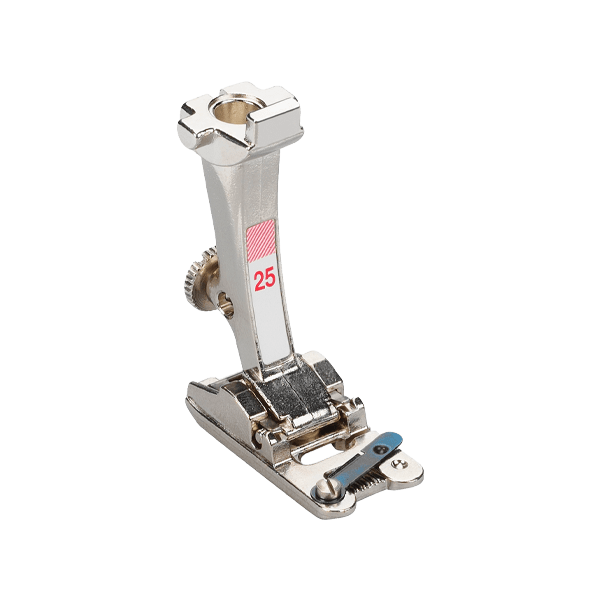 The Cording Foot with 5 Grooves #25 is a practical aid for the simultaneous couching of several parallel strands of yarn or cording. The cords are fed into the special grooves, which guide them securely. They are also held in place by a swing-out latch which prevents them tangling during the sewing process. In this way, the Cording Foot with 5 Grooves #25 lets you create glamorous trim appliqués and braid for home furnishings and garments.