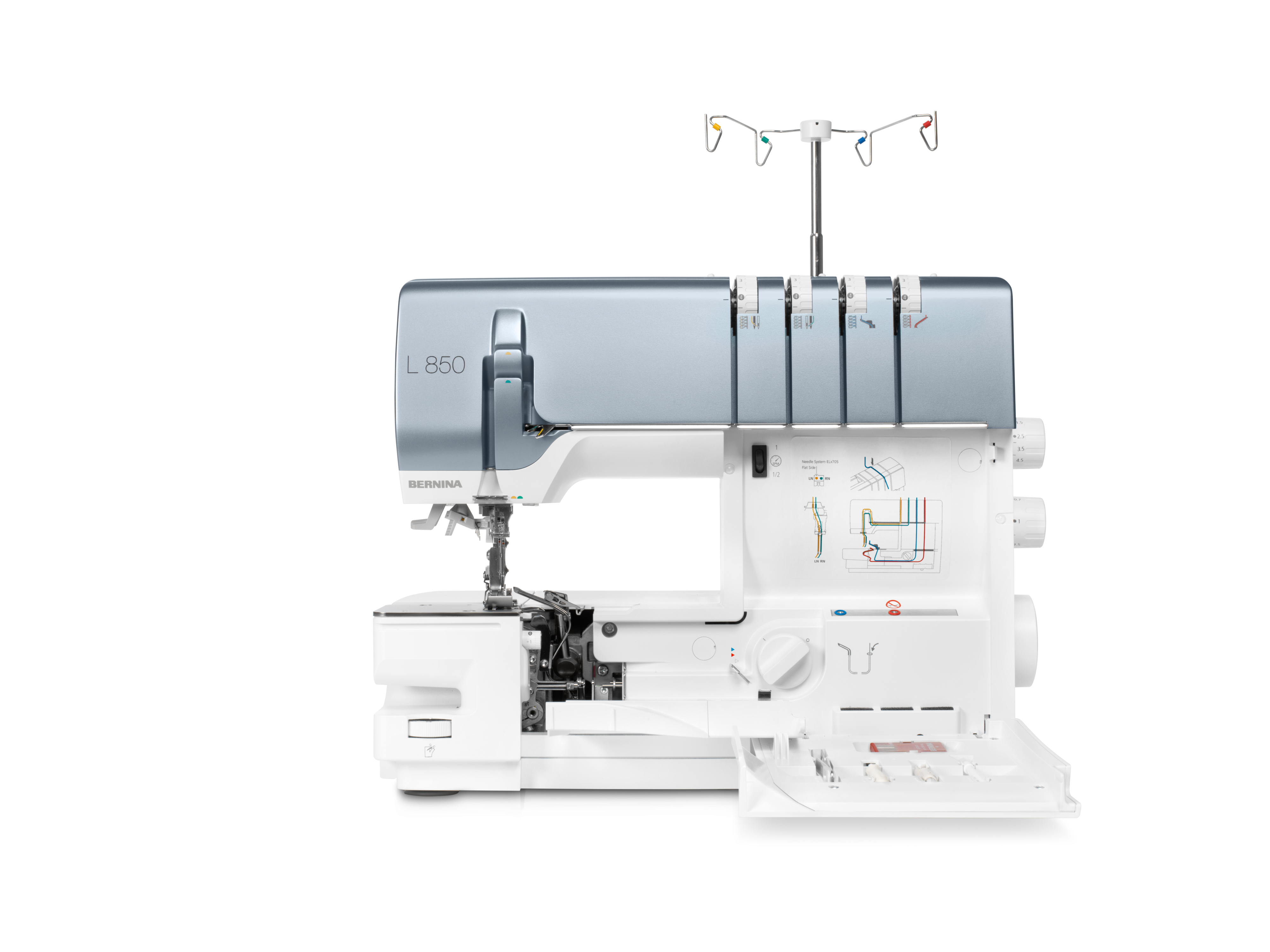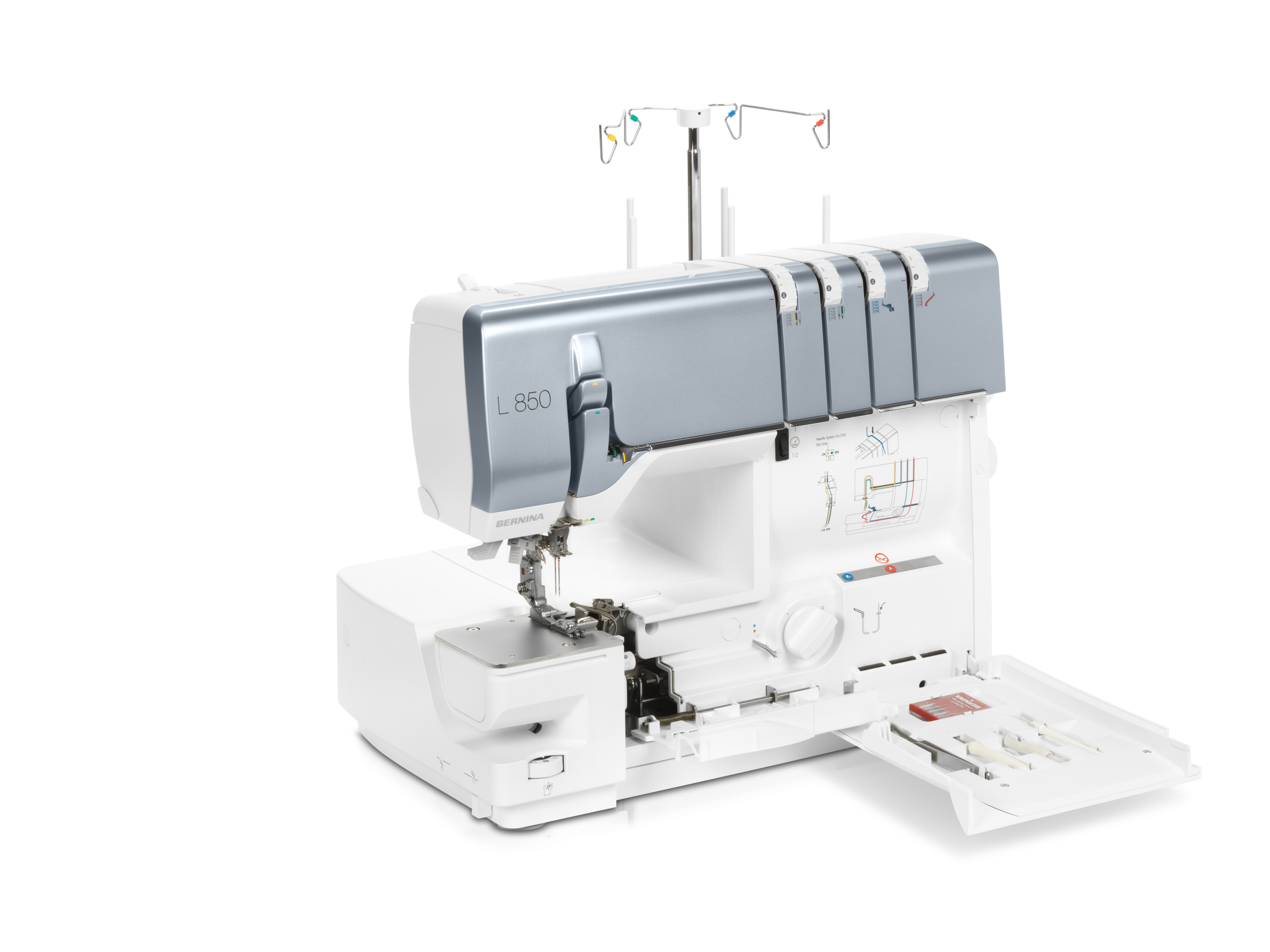 Sewing with the BERNINA L 850 is comfortable and convenient. The presser foot can be easily raised and lowered using the BERNINA Free Hand System (FHS), allowing for hands-free fabric guidance. The presser foot also swings out, providing easy access to the needles. The L 850 offers a generous sewing space, with ample room to the right of the needle and an included extension table for additional workspace. The convenient freearm enables hassle-free sewing of closed items, such as sleeves or cuffs. The machine features one-path, color-coded threading, an automatic needle stop up function, and an integrated Needle Threader, ensuring quick and hassle-free threading and easy transition between different stitch types. With its combination of advanced features, superior stitch control, and ergonomic design, the BERNINA L 850 is a top-of-the-line serger that will exceed your expectations.