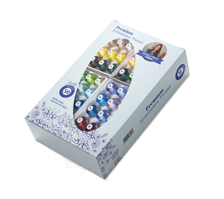 A vibrant and colorful thread collection specially curated by Angela Wolf, this set includes 50 spools of 40-weight color-fast 100% polyester thread. These colors will coordinate with the Angela Wolf design collection launching with the new Aveneer EV-1.