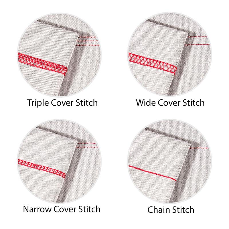 • Tri-cover (6mm), Wide Cover (6mm), Narrow (3mm) cover and chain stitching capacity