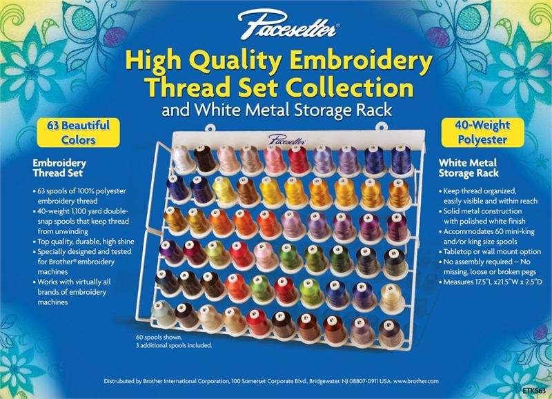An attractive way to showcase the beautiful Pacesetter polyester thread color collection. This set includes 63 spools of 100% polyester embroidery thread of 40-weight, 1,100 yard double-snap spools that keep thread from unwinding. The thread is specially designed and tested for Brother embroidery machines. The metal rack fixture is made with a polished, white finish to blend in and complement and home-studio décor. It accommodates 60 mini-king and/or king size spools and can be a tabletop display or wall mounted. No assembly required. Measures 17.5”L x 21.5”W x 2.5”D