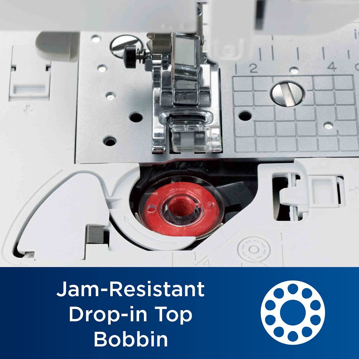 Advanced features include button stitch, length and width selection, tension adjustment dial, backlit LCD screen displaying recommended sewing foot, reverse sewing button and adjustable sewing speed