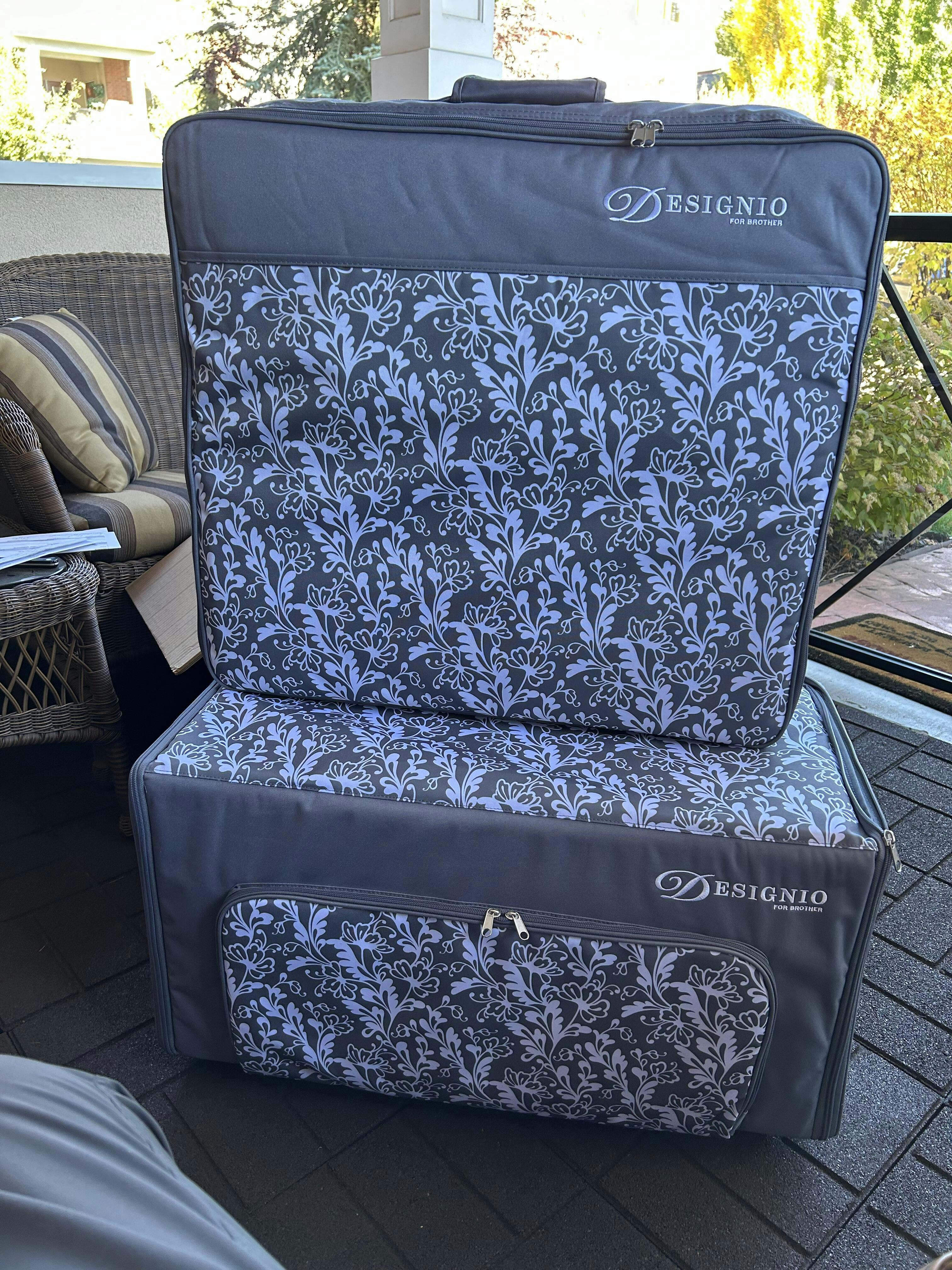 An elegant and sophisticated luggage set that fits your Luminaire XP3, embroidery arm, and all included accessories. Perfect for travel or going to class, this sturdy luggage set has a telescopic handle and 360-degree wheels making it easy to ‘stow and go’. Safely store your Luminaire XP3 with this four-piece luggage set!