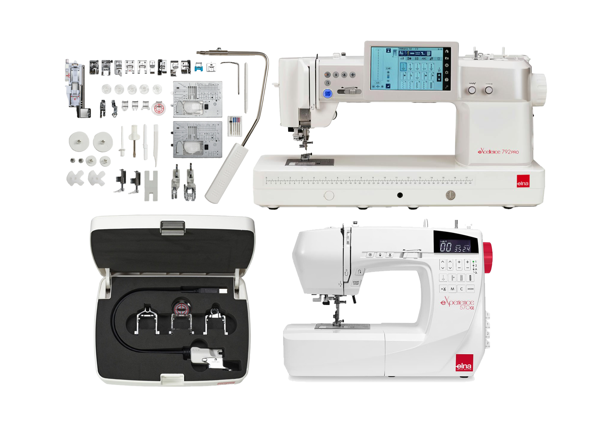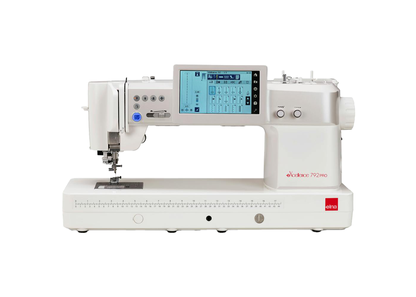 The Elna eXcellence 792 Pro Sewing and Quilting Machine is the next generation of sewing with exceptional space, immense power, and endless technical and creative ability. Satisfying the highest standards of quilters and sewers, this breakthrough model features a flat-bed design with a full aluminum body, an extra-large sewing area, a 7" HD color touch screen, up to 1300 stitches per minute, nine high-illuminance LED lighting in 4 locations, Superior System needle threader, bobbin thread sensor, state-of-the-art 7-piece feed dog, Advanced Dual Feed and Dual Feed Plus system, Accurate Stitch Regulator (A.S.R.), automatic one-step needle-plate conversion, 3 MB integrated memory and USB port, an extra-wide extension table with built-in accessory storage, and so much more! Loaded with 450 stitch patterns, 12 one-step automatic buttonholes, one sensor buttonhole, three alphabet fonts, and pattern combos up to 100 stitches, the Elna eXcellence 792PRO offers a fresh, cutting-edge, exciting stitching experience!