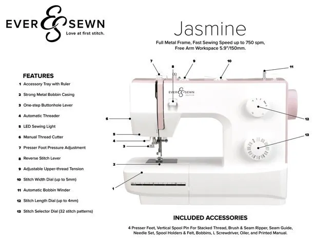The EverSewn Jasmine Mechanical Sewing Machine is the perfect introductory machine equipped with essential functions to meet everyday sewing needs. Featuring 32 built-in stitches (including a buttonhole), a built-in needle threader, thread cutter, front-loading bobbin, free arm capability, onboard accessory storage, adjustable foot pressure, bobbin winder, and a solid metal frame, the EverSewn Jasmine has everything a beginner could want! The adjustment dials make this machine easy to operate, allowing you to spend more time creating stunning projects. At only 13.5 pounds, you can even take the EverSewn Jasmine Mechanical Sewing Machine with you to alterations and classes!