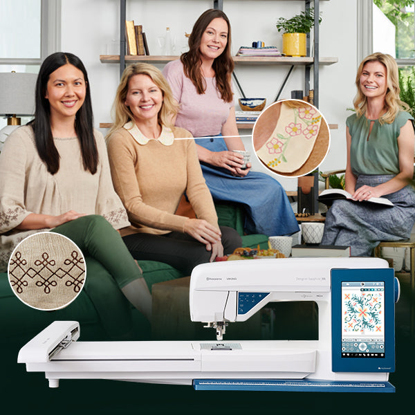 Husqvarna Viking Holiday Sales Event: For a limited time receive a FREE Quilter's Hoop, Majestic Hoop, Tear Away Stabilizer, Cut Away Stabilizer, AquaMagic Stabilizer, AND a 1yr CREATIVATE Essential subscription when you purchase a Designer Sapphire 85 Sewing and Embroidery Machine from World Weidner!