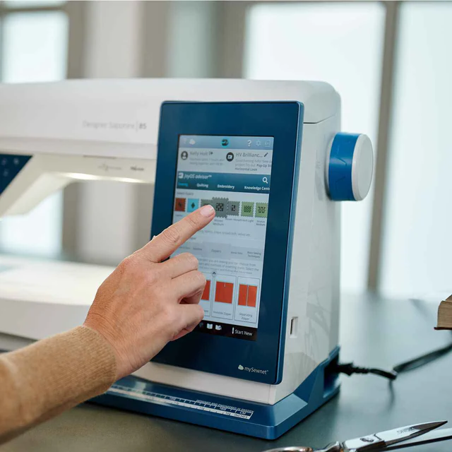 Introducing the HUSQVARNA® VIKING® DESIGNER SAPPHIRE™ 85, a sewing and embroidery machine that is designed to inspire your creativity and take your sewing projects to the next level. This machine is perfect for those who love to settle into their favorite nook and create their sewing story. With its advanced technology and industry-leading features, you will be captivated by the DESIGNER SAPPHIRE™ 85. It is mySewnet™ enabled, allowing you to connect to mySewnet™ apps, update your machine, wirelessly transfer designs between devices, and more. It also gives you access to a continuously growing library of high-quality embroidery designs directly on the screen.