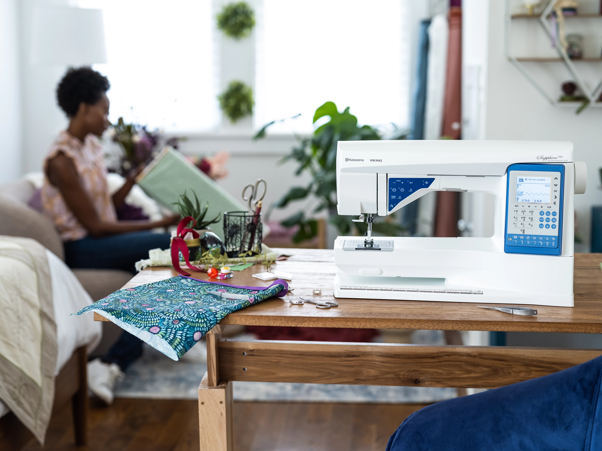 Introducing the SAPPHIRE™ 930 by Husqvarna Viking, a sewing machine designed to blend colors and weave memories. This advanced machine offers a plethora of features to assist and guide you throughout your sewing journey. The SAPPHIRE™ 930 boasts a large sewing space, perfect for managing large projects. With the touch of a button, threads are cut, leaving your project still in the machine. The machine intuitively makes most settings based on the fabric or stitch you are using, allowing you to focus on what you love - sewing!