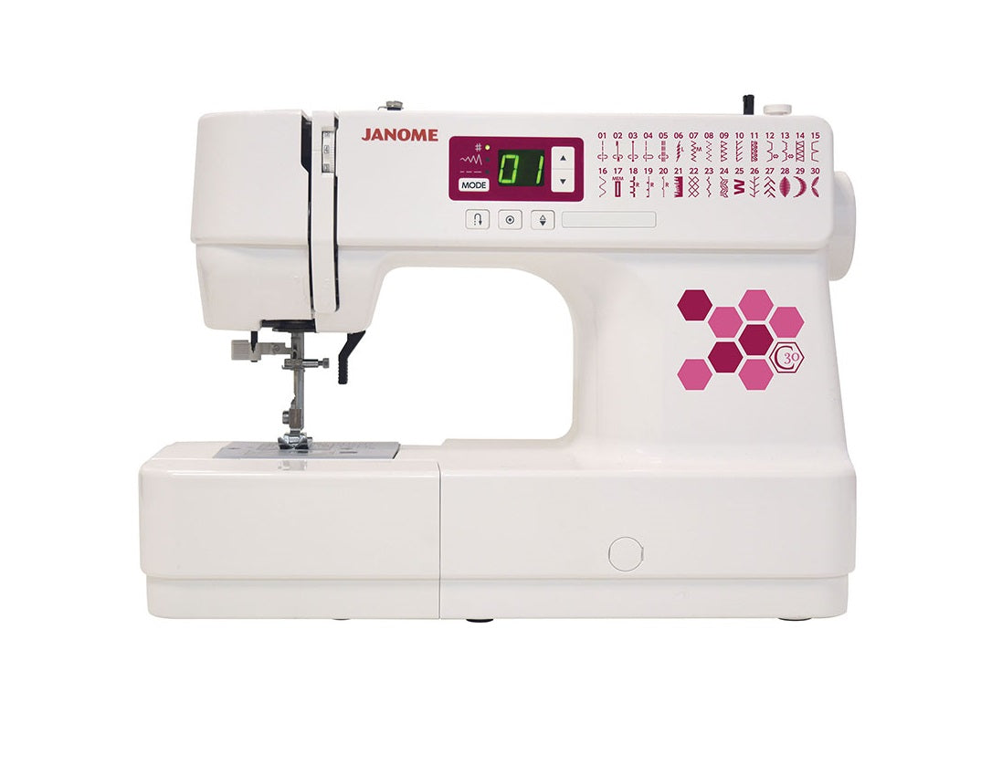 The Janome C30 sewing machine has 30 built-in stitches, and with a jam-proof top drop-in bobbin and easy to read LCD display, you'll be sewing like a professional in no time. By the screen, you'll find great convenience buttons for easy sewing including a locking stitch button, easy reverse button, and needle up/down button. Easily control your sewing speed by using the foot control. The machine weighs just 11 pounds, making it easily portable.