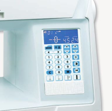 Right by the needle, you’ll find a start/stop button for sewing without the foot control and a reverse button. There is also a locking stitch button and needle up/down button. The start/stop button allows the machine to sew without using the foot pedal. This feature is great for sewing long seams or for quick mending. The reverse button allows you to easily backstitch for locking seams. With the tip of your finger, this conveniently located button can also be used to stop a stitch pattern before its completion. The locking stitch button ties off the end of the thread. No need to backstitch to lock a seam. This is ideal for securing seams on delicate fabrics or when using decorative stitches. Thread the machine up to the needle and then let the built-in needle threader take over to get the thread through the eye of the needle. The Backlit LCD screen makes it much easier to see what you're creating.