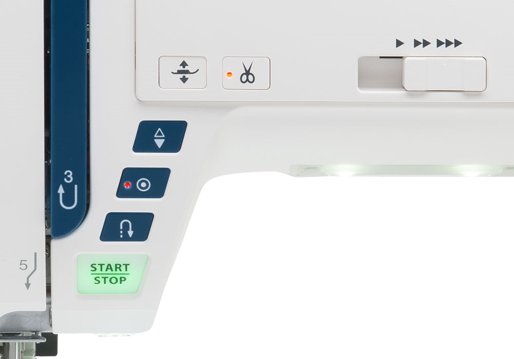 The most important functions are perfectly placed for effortless access. The Skyline S9 includes a start/stop button, reverse function, locking stitch, needle up/down, thread cutter and most importantly: an automatic presser foot lift.