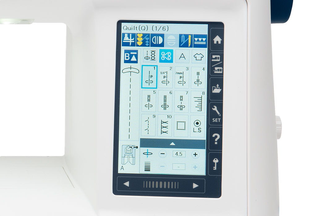 Enjoy choosing up to 250 embroidery designs, including 40 exclusive designs by Anna Maria Horner along with 300 stitches. With a maximum embroidery size of 6.7" x 7.9" and sewing speeds of 1000 SPM, the Skyline S9 provides a full suite of powerful capabilities to ensure all projects are beautiful, yet easily executed. Navigating through these great features is easy with the Skyline S9's LCD color touchscreen.