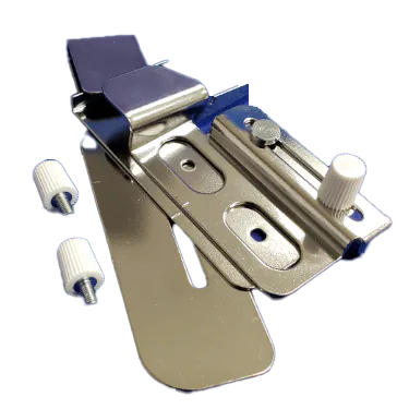 This guide is used for setting the folded width of the fabric and the stitching position for coverstitching. This guide can set the folded width of the fabric and align the edge of the fabric from the back side, where it is difficult to see the coverstitching. First fold the fabric to the width that is to be sewn and then adjust the guide according to the width of the fold. This guide is perfect for finishing pants and sleeve hems of clothes. Foot is not included.