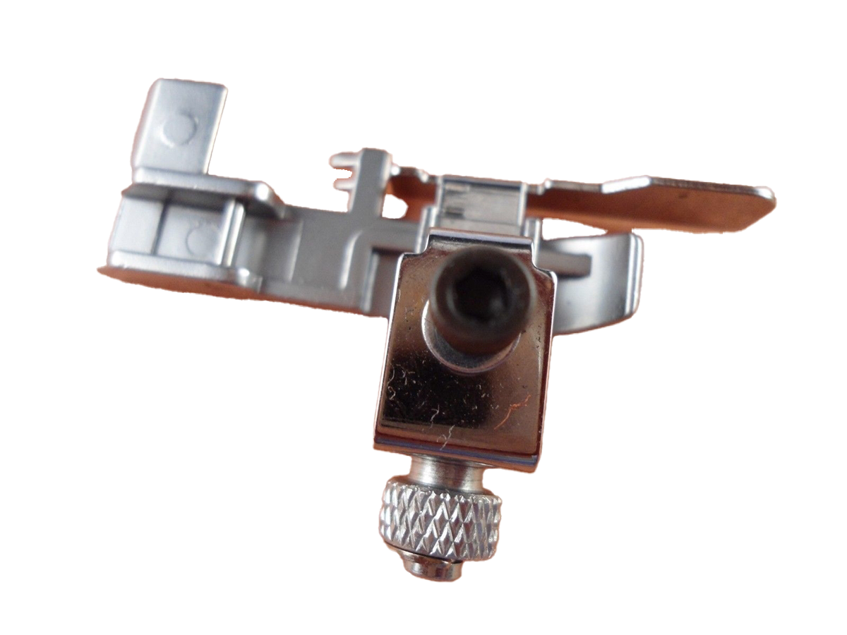 This presser foot is used to sew blind hem stitching, decorative flatlock or pin-tucks. This presser foot can be used with either the right or the left needle and has a guide plate that can be moved within a wide range. Since the seam width can be adjusted, this presser foot is also useful for decorating by sewing along a folded edge with decorative flatlock or with roll hem (pin-tuck) stitches.