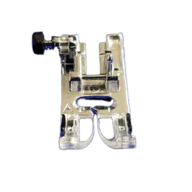 This standard presser foot is used for sewing straight stitches and zigzag stitches. It can be used to sew lightweight to heavyweight materials. The wide needle entry opening allows this presser foot to be used for a variety of fabrics and applications, from straight stitches to zigzag stitches. Press the black button to keep the presser foot horizontal in order to smoothly begin sewing at a thick seam.
