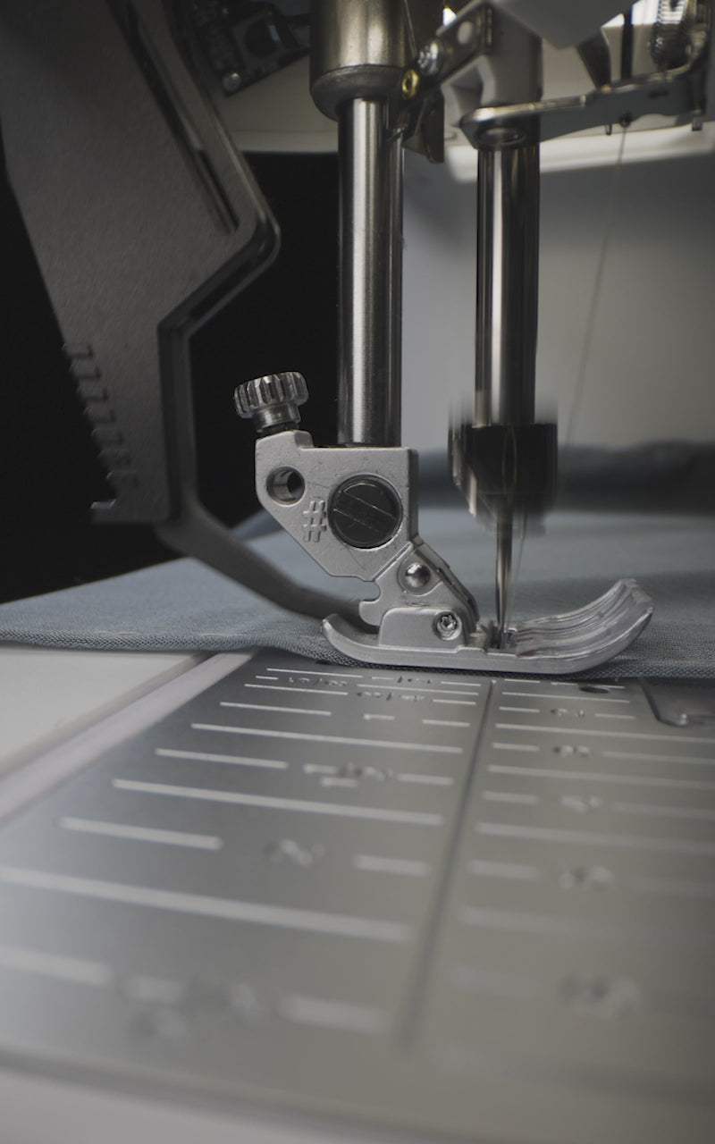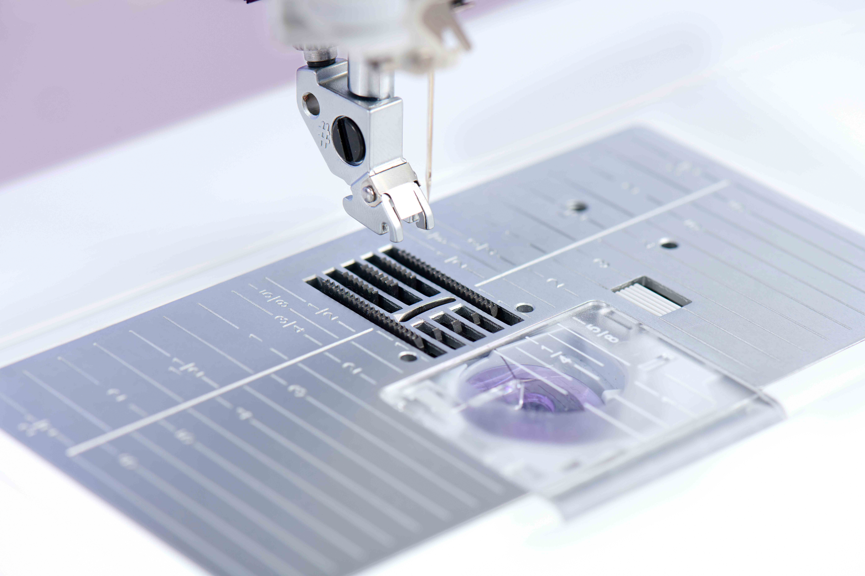 Bright, even lighting designed by optronic experts shows the true color of fabric and limits shadows on projects. High needle piercing power (150NWT) makes it easier to sew heavy weight materials. The machine's base plate is engineered to reduce vibrations and increase stability
