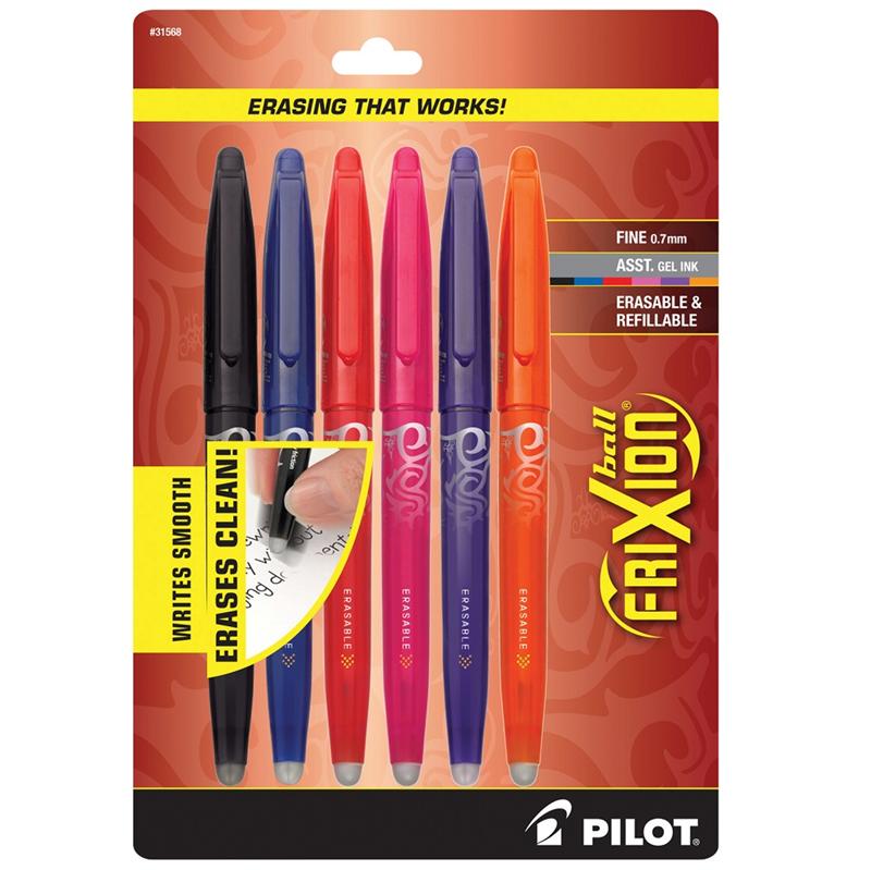 Pilot FriXion Ball Erasable Gel Pens allow you to erase and rewrite repeatedly without damaging documents. The thermo-sensitive gel ink formula disappears with the erasing friction of a rubber tail plug eraser on the pen. Erasing leaves no residue or debris. Each pen can write on the same spot that has been erased. Each gel rollerball pen delivers smooth writing gel ink and is not recommended for signatures, examination papers or official documents where writing needs to remain permanent or for exposure to extreme temperatures. Get the technology of FriXion with needlepoint precision! This pack contains 6 fine point pens. One each of Black, Blue, Red, Pink, Purple, and Orange.