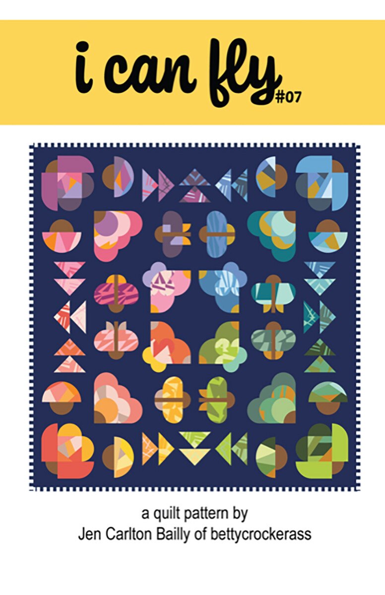 The I Can Fly Quilt by Jen Carlton Bailly of bettycrockerass was inspired by the bright colorful artwork of Mary Blair in the Golden Book "I Can Fly" and is fat quarter friendly. Come, fly with me, learn how to sew curves, and make these improv patchwork moths. The pattern uses Jen's Make it Curvy template set and includes a QR code where it can be downloaded from her website. Finished size is 80" x 80".