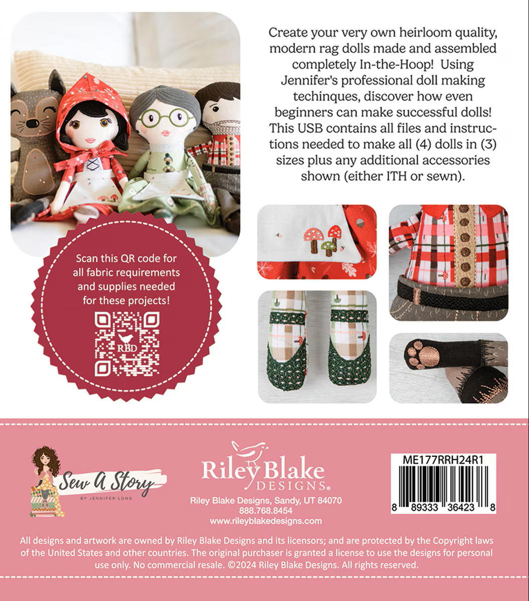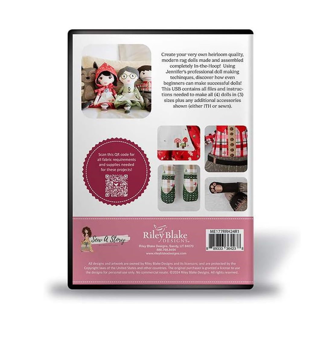 Designed by Jennifer Long. Create your very own heirloom quality, modern rag dolls made and assembled completely In-the-Hoop! Using Jennifer's professional doll making techniques, discover how even beginners and children can make successful dolls! Stitch out the characters from the Little Red Riding Hood story and inspire the next generation. This USB contains all files and instructions needed to make all (4) dolls in (3) sizes plus any additional accessories shown (either ITH or sewn). Click here for fabric requirements. ITH doll construction, techniques, and processes are owned by Sew A Story and used under license.