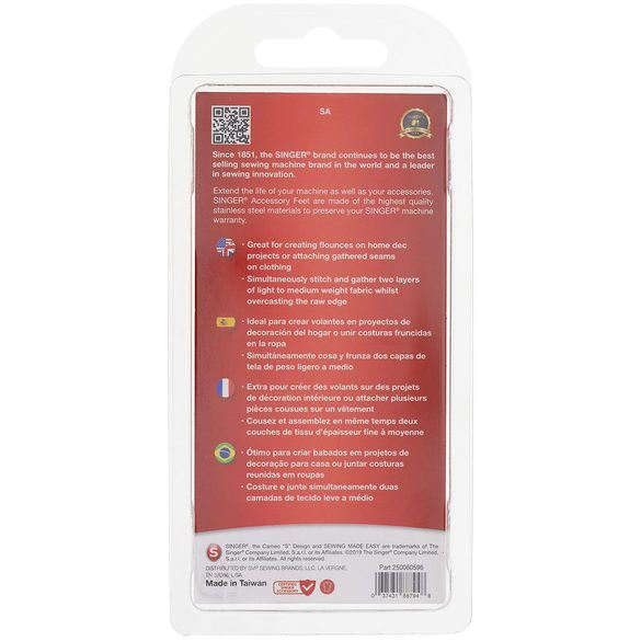 Simultaneously stitches and gathers two layers of light to medium weight fabric while your serger finishes the edge. Great for creating flounces on home dec projects or attaching a gathered layer onto any of your inspirations.